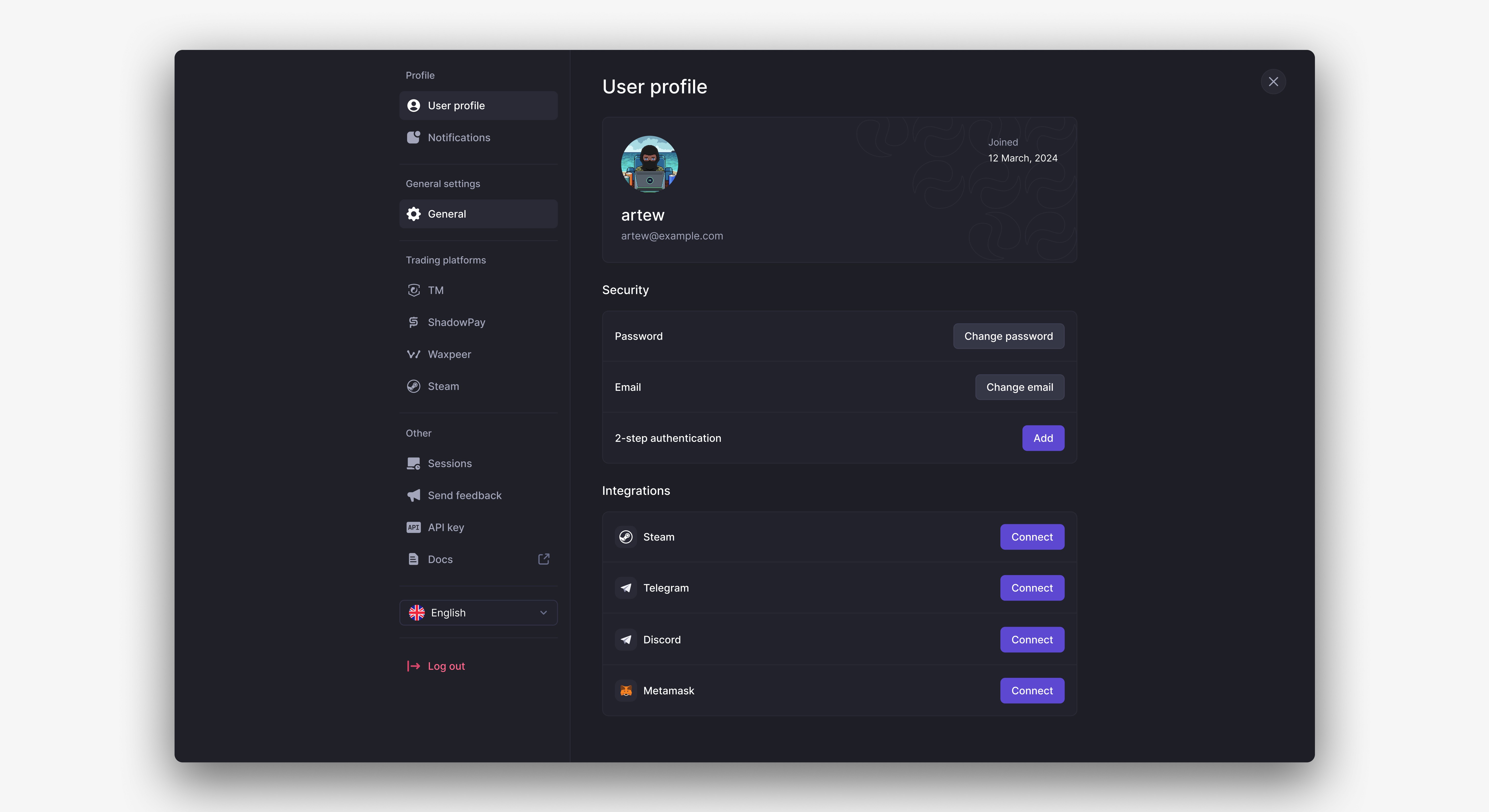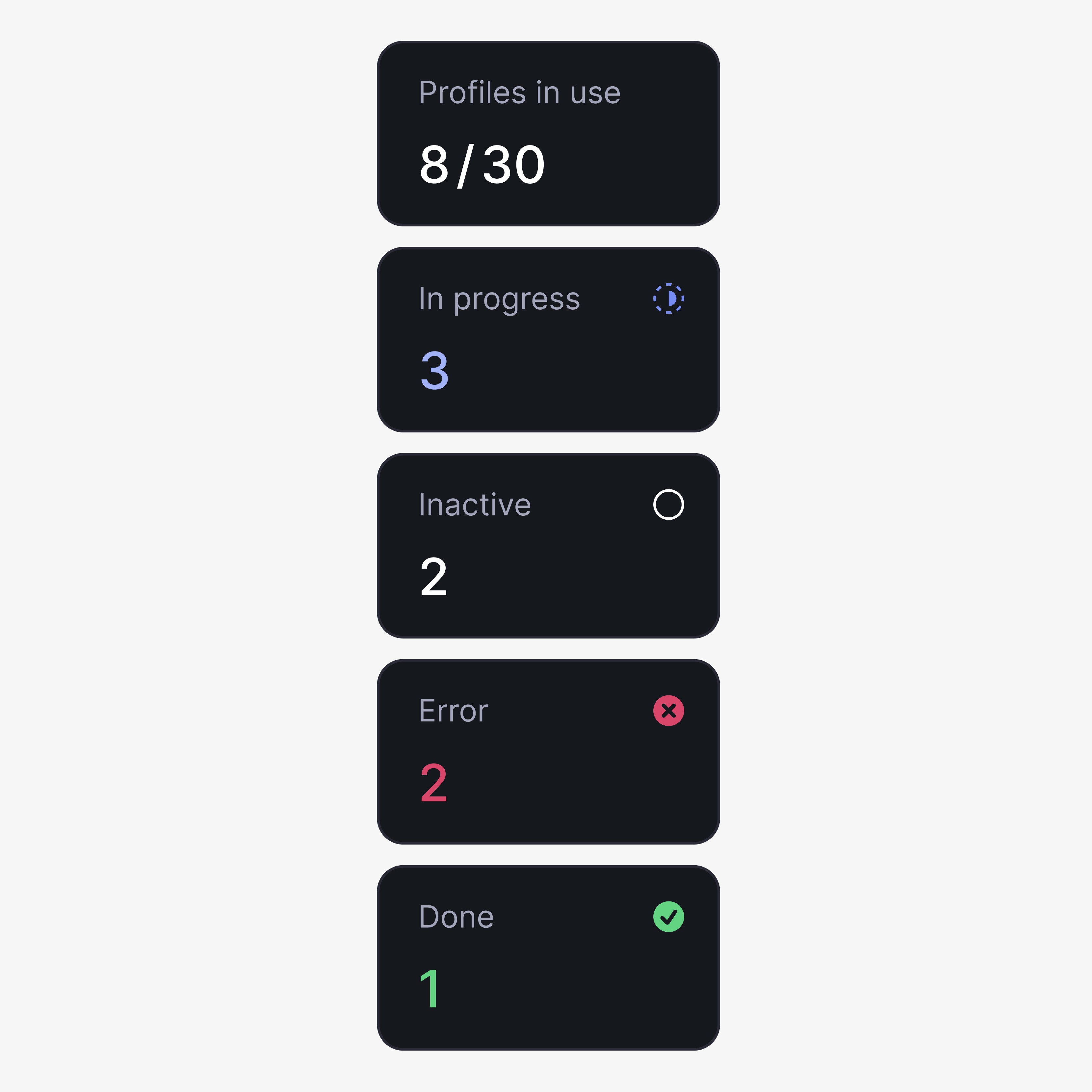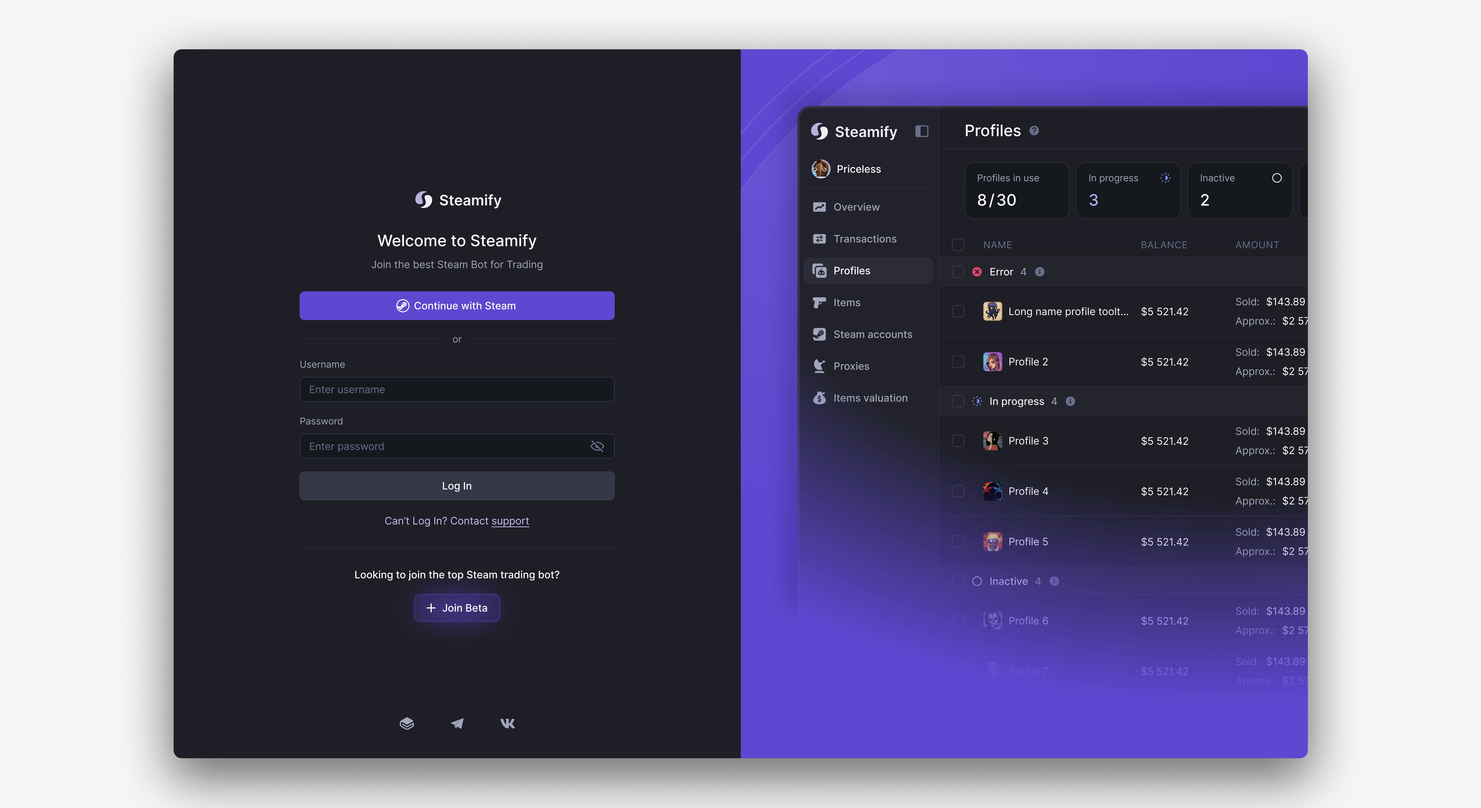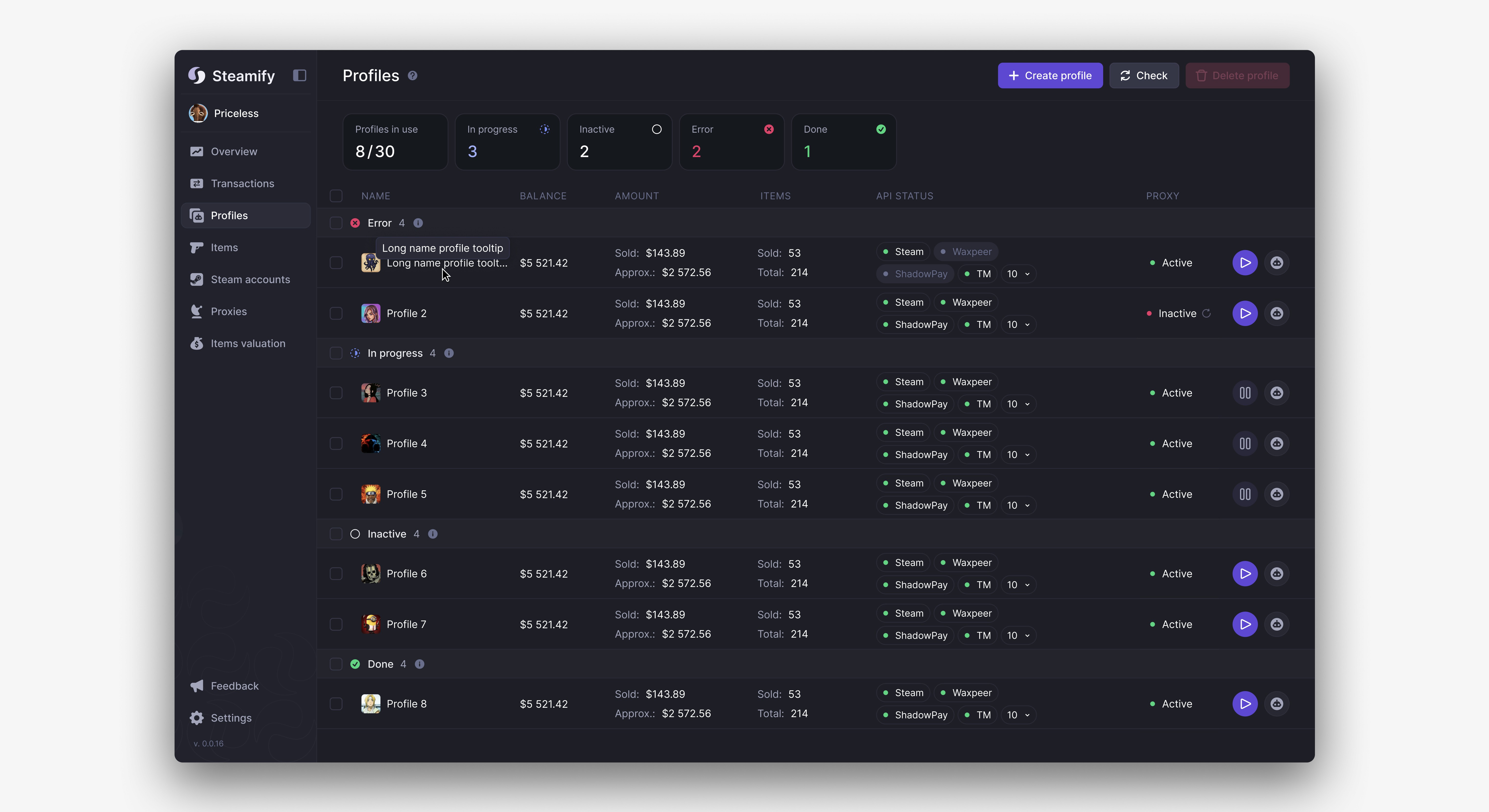 Profiles represent the bots responsible for selling users’ items. Each profile can have one of four statuses: Error, In Progress, Inactive or Done.
