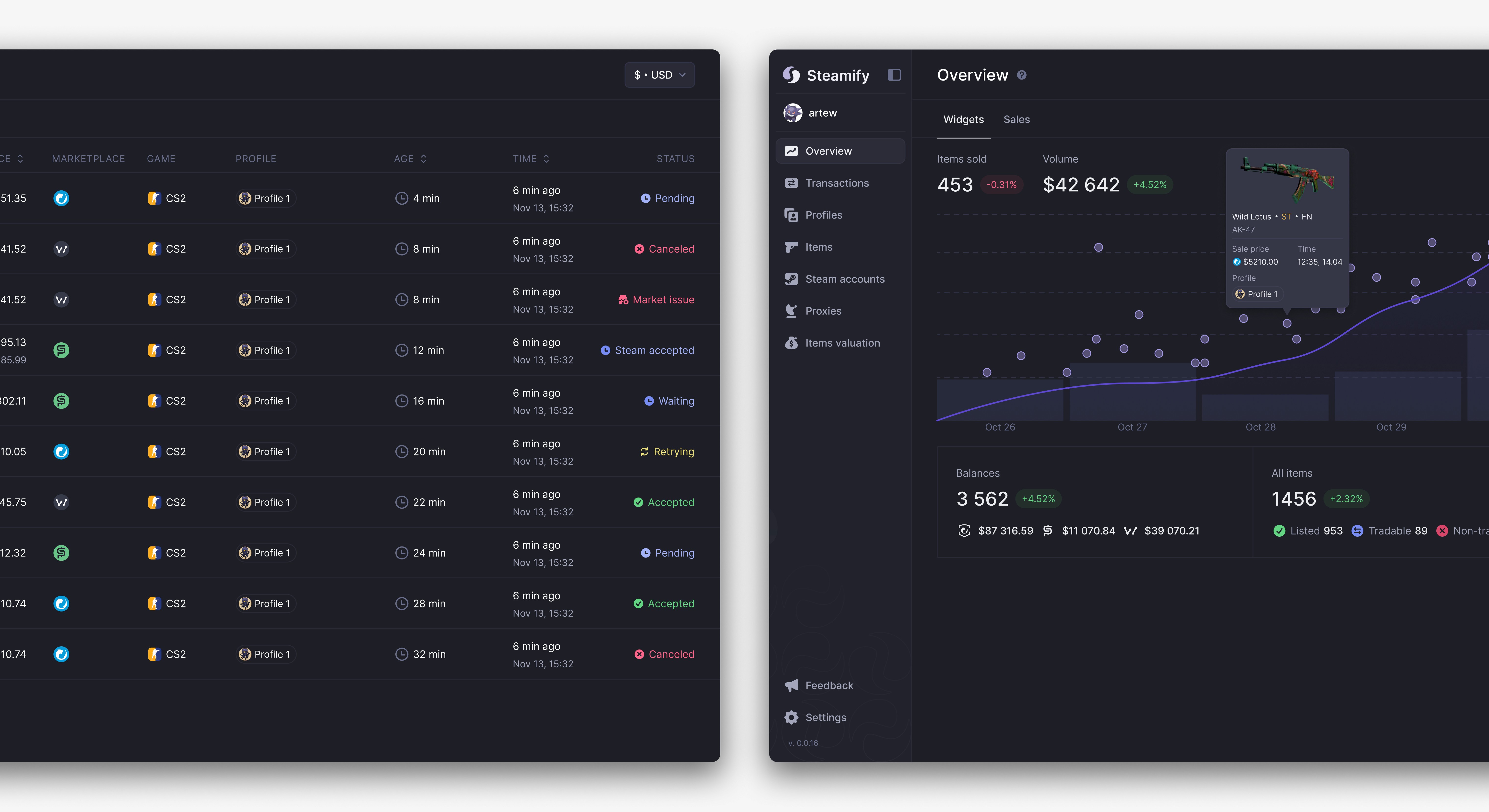 The Widgets section functions as a centralized dashboard, displaying key performance indicators across all Steam accounts connected to Steamify. Users can filter data by selecting a specific time range via the integrated calendar, enabling more flexible performance analysis.
