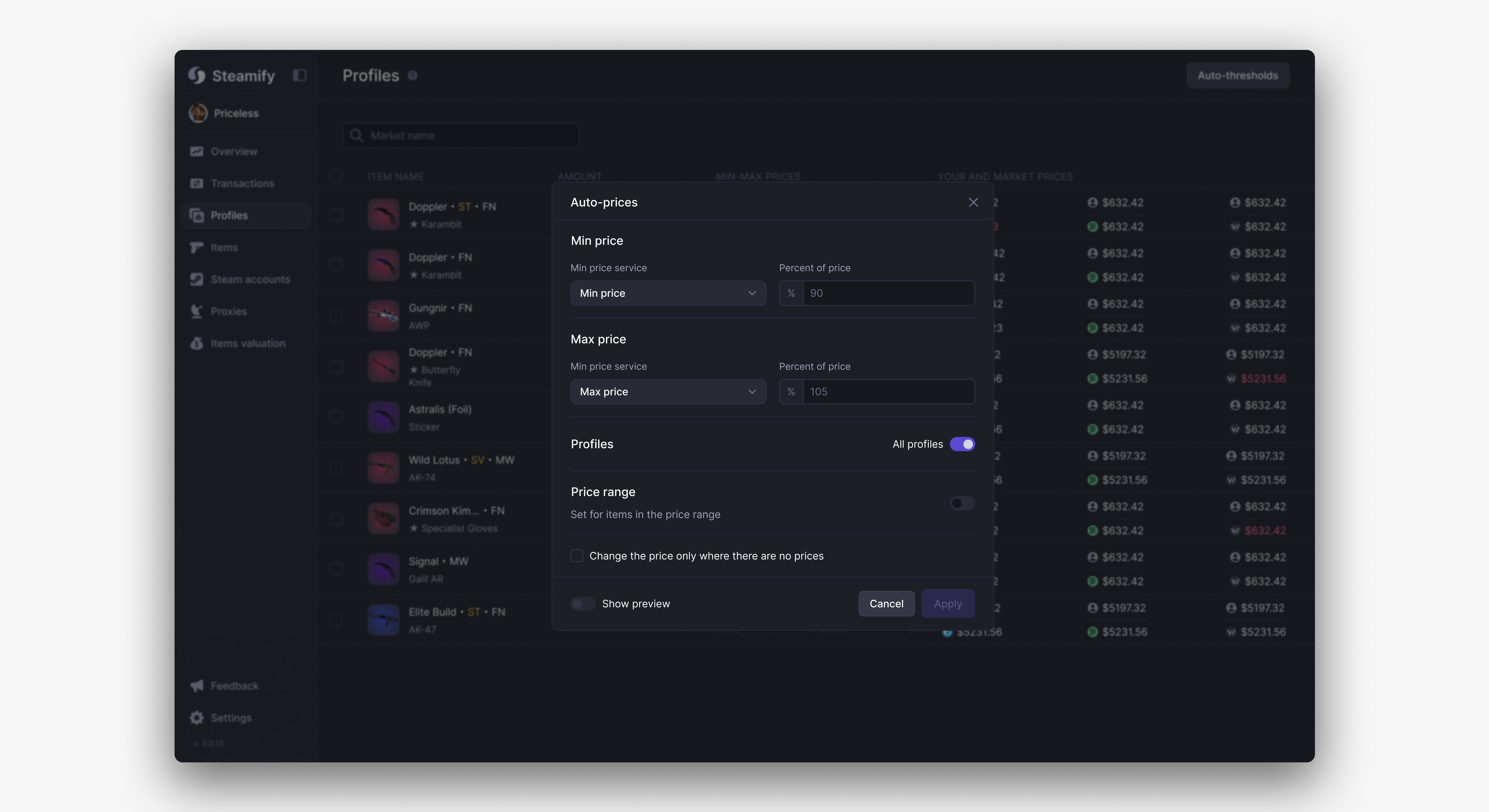 On this page, users define minimum and maximum pricing thresholds for their items. Each item’s uniqueness is visually emphasized through background color coding, reflecting rarity standards familiar to Steam traders and improving quick recognition.